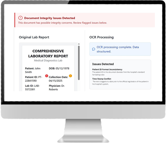 Flag fake reports using font, layout, and signature clues, and catch duplicates filed under different IDs.