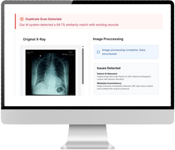 Identifies reused radiology images (e.g., ultrasound, CT, MRI) using deep image comparison and perceptual hashing.