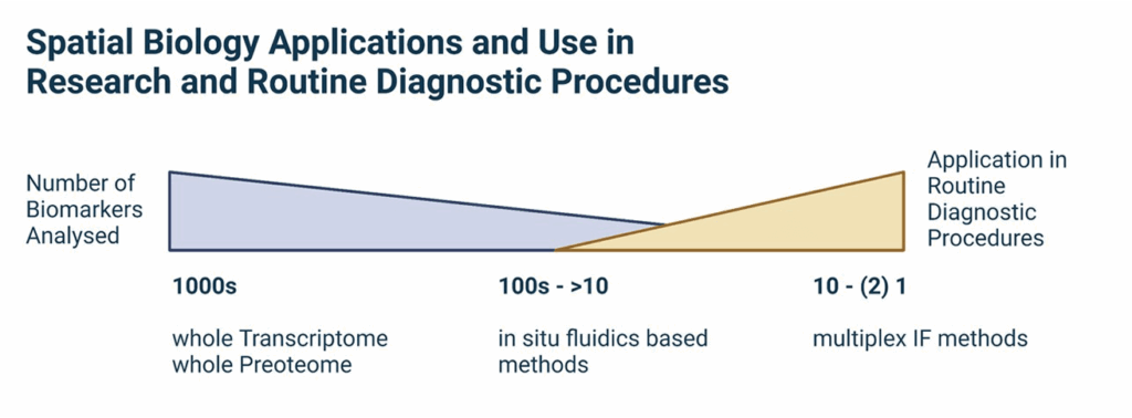 - Integration with existing pathology workflows: Spatial biology technologies are still relatively new, and there is a learning curve for pathologists who are not familiar with these tools. Additionally, integrating spatial biology data into existing pathology workflows can be challenging. Pathologists must be able to seamlessly integrate spatial data with traditional histopathology data, which requires specialized expertise.